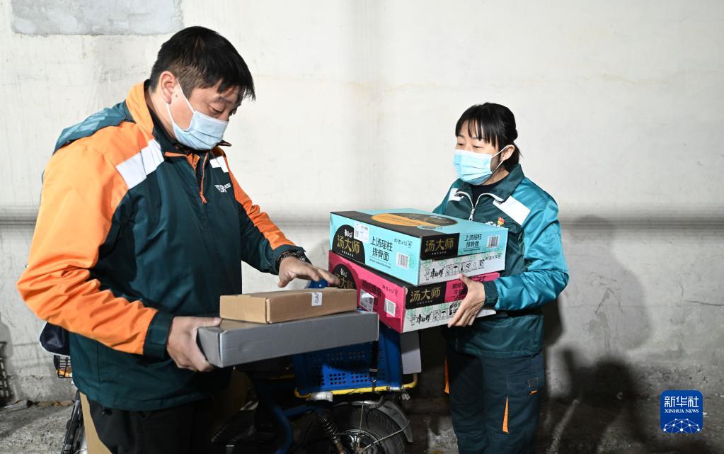 11月7日,在中国邮政集团有限公司天津市和平区分公司贵州路速递营业部,刘婷(右)与同事接收新揽收快件。