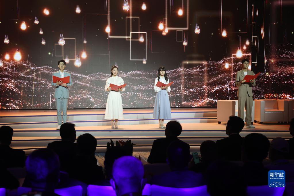 11月10日,演员辛云来、邓恩熙、徐娇、王广源(从左至右)在2022年中国金鸡百花电影节开幕式上表演诗朗诵《时代之声》。