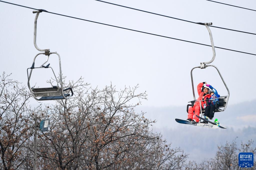 11月11日,滑雪爱好者乘坐庙香山滑雪场缆车。