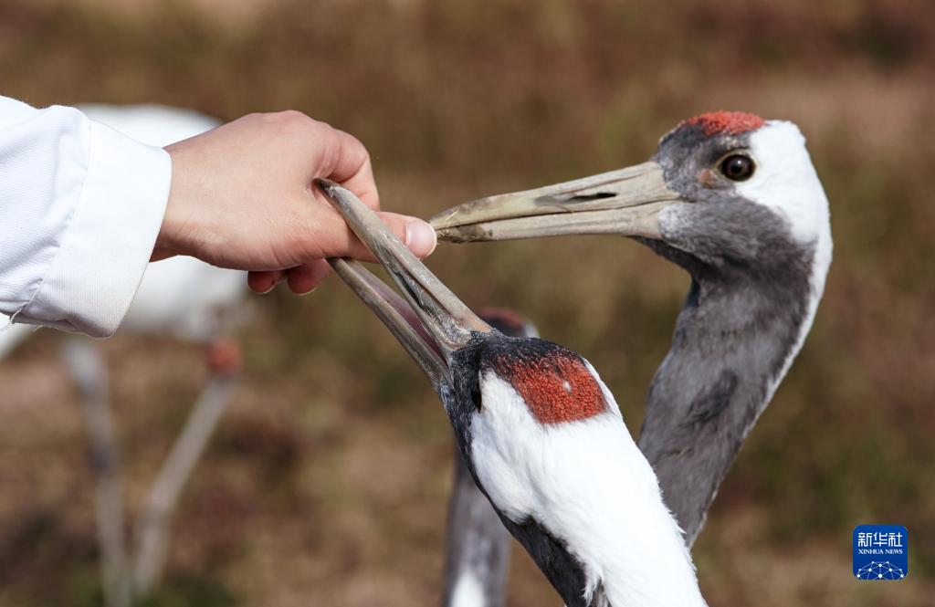 保护区驯养员与人工繁育的丹顶鹤互动(11月8日摄)。