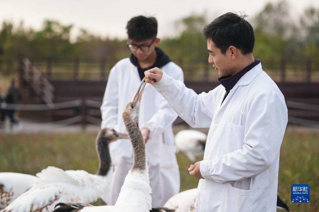 保护区驯养员姜官宏(右)和蔡新杰与人工繁育的丹顶鹤互动(11月8日摄)。