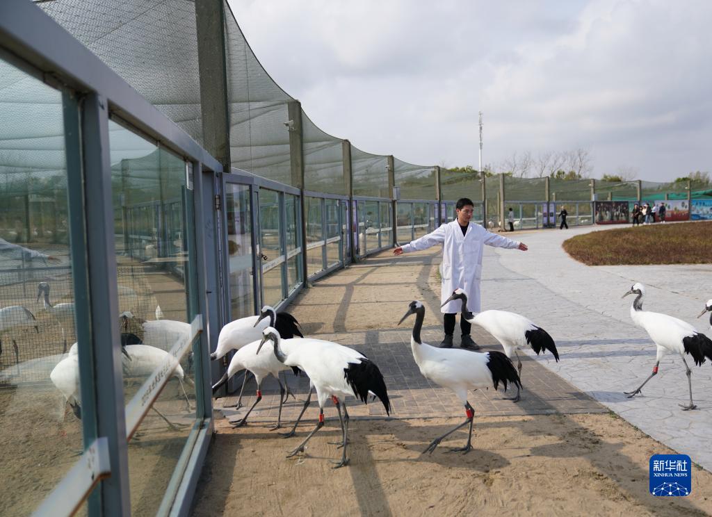 保护区驯养员姜官宏将放飞结束的人工繁育的丹顶鹤带进鹤舍(11月8日摄)。