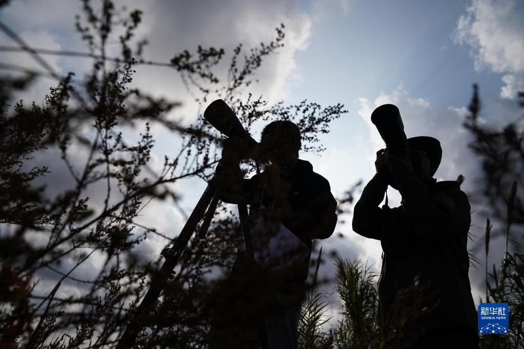 保护区科研人员李征浩(左)和赵永强在开展鸟类多样性调查和监测(11月8日摄)。