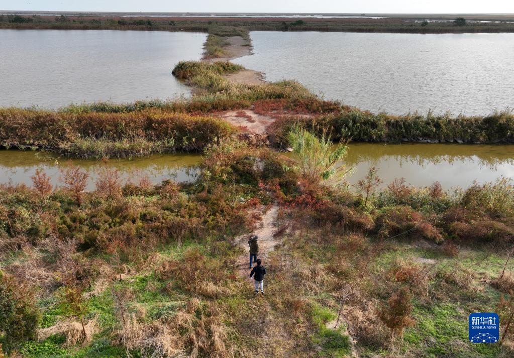 保护区科研人员李征浩(下)和赵永强前往目的地,开展鸟类多样性调查和监测(11月8日摄,无人机照片)。