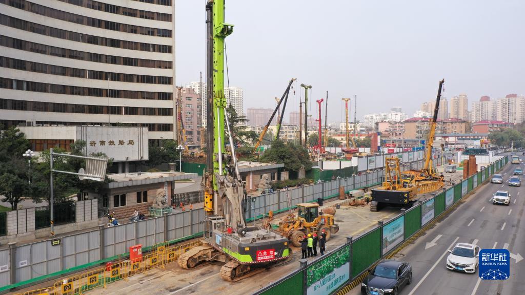 11月11日,在济南地铁6号线济南站,中铁十局工作人员在进行主体围护结构首桩开钻作业(无人机照片)。