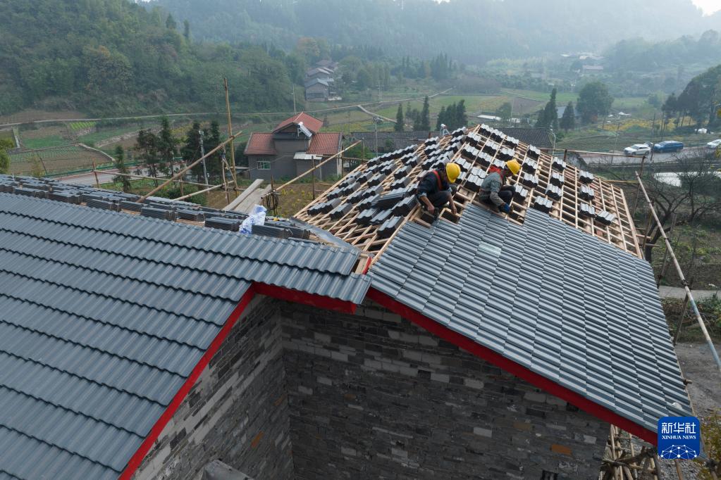 11月11日,在重庆市北碚天府镇,施工人员在对农房进行屋顶更换作业(无人机照片)。