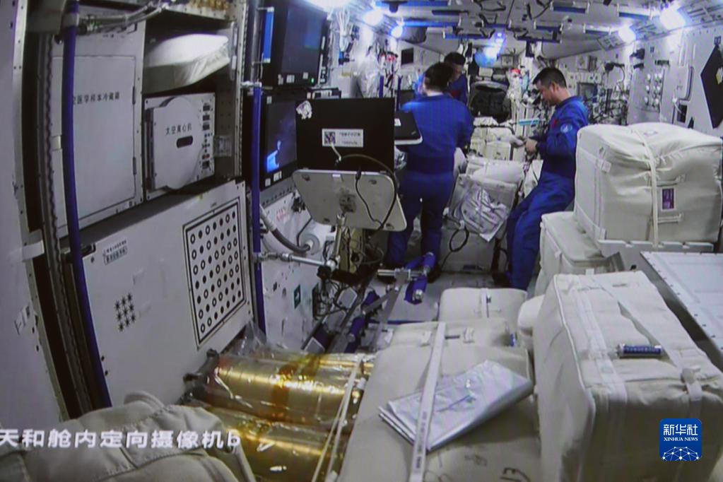11月12日,在北京航天飞行控制中心拍摄的天舟五号货运飞船与空间站组合体完成自主快速交会对接后天和核心舱内的情况。
