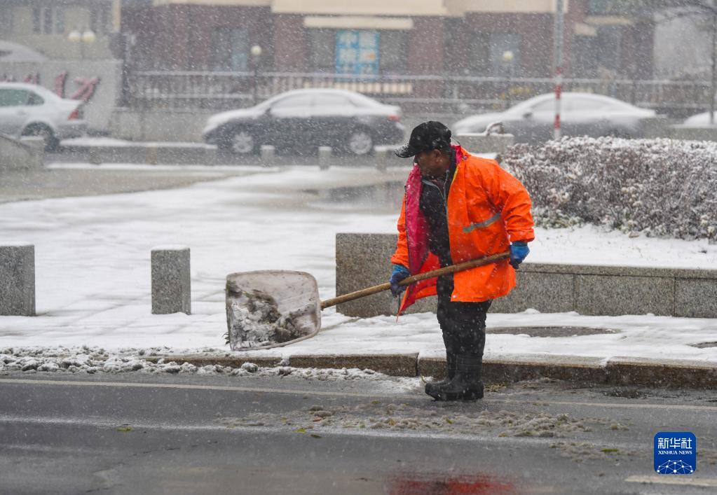 11月12日,在吉林省吉林市,环卫工人在清理马路积雪。