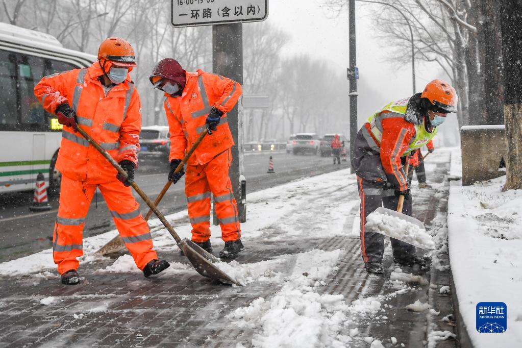 11月12日,环卫工人在长春市自由大路清理积雪。