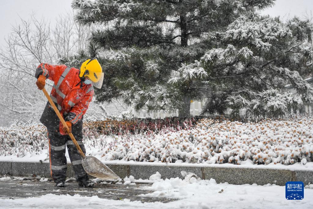 11月12日,环卫工人在长春市自由大路清理积雪。