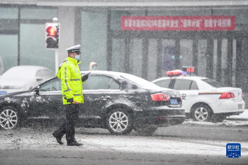 11月12日,交警冒雪在长春市自由大路上执勤。