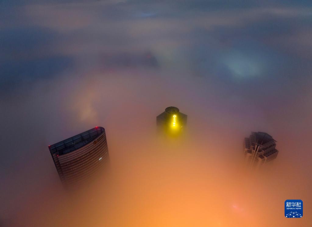 江苏省淮安市的建筑在大雾中若隐若现(11月10日摄,无人机照片)。