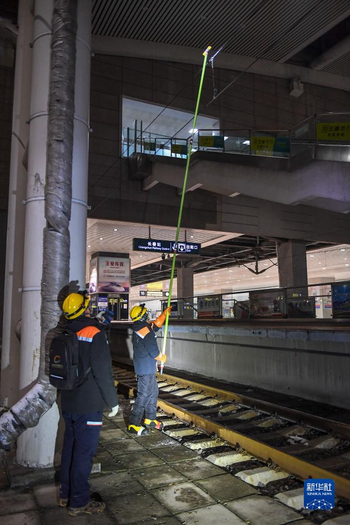 11月13日,在长春火车站,中国铁路沈阳局集团有限公司长春高铁基础设施段工作人员清理接触网上的结冰。
