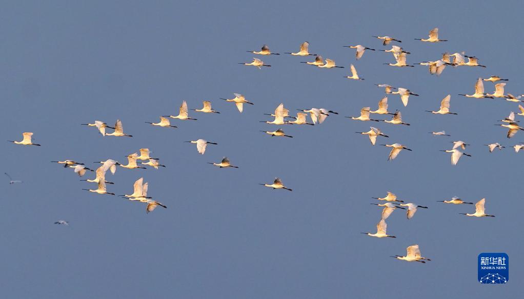 11月11日,一群白琵鹭在江西鄱阳湖南矶湿地国家级自然保护区的湿地上空飞翔。