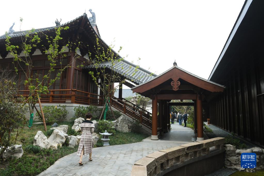 11月14日,一名女子行走在南宋德寿宫遗址博物馆的园林建筑之中。