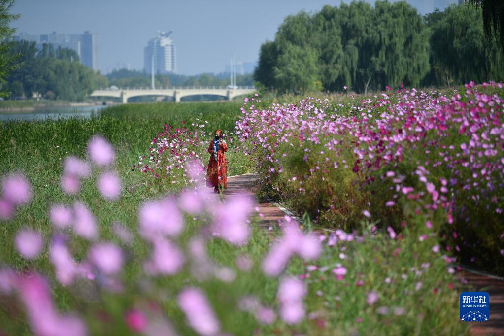 市民在宁夏银川市典农河畔散步(2022年9月13日摄)。