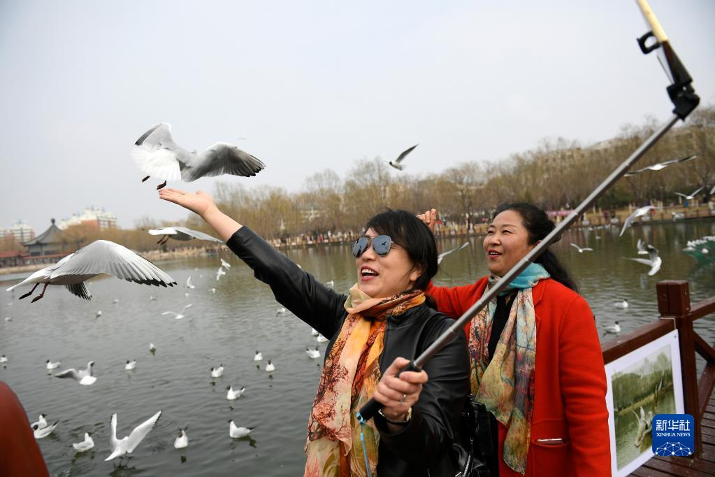 市民在宁夏银川市燕鸽湖观赏、喂食红嘴鸥(2017年3月20日摄)。