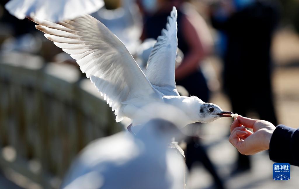 2020年3月14日,市民在宁夏银川市海宝公园喂食红嘴鸥。