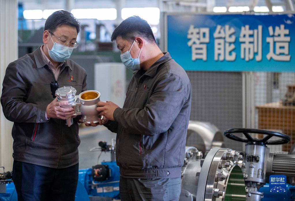 在位于宁夏吴忠市的吴忠仪表有限责任公司,马玉山(左)与技术人员交流(11月12日摄)。
