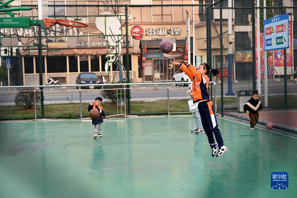 11月15日,小朋友在铜陵市一处“口袋公园”内练习投篮。