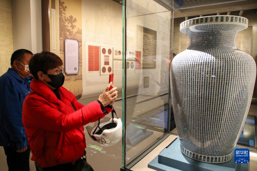 11月16日,游客在中国文字博物馆续建工程展馆内参观拍照。