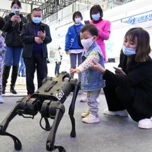 11月16日,在第十届中国(绵阳)科技城国际科技博览会上,小朋友与仿生智能四足机器狗互动。