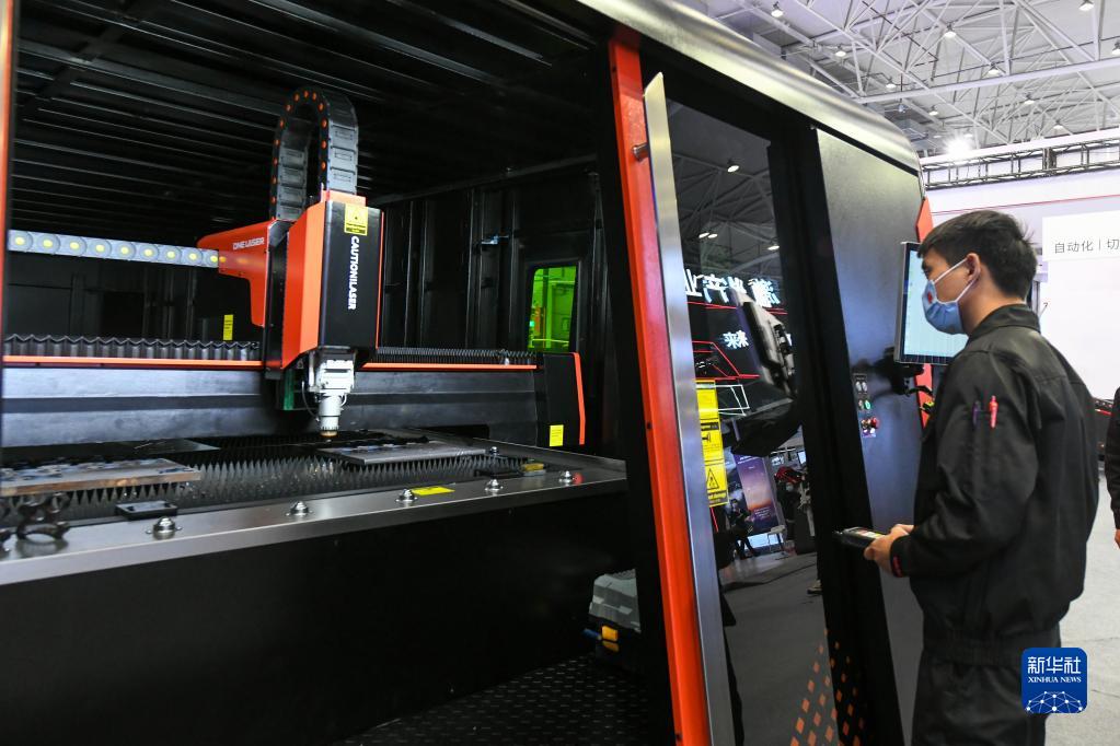 11月16日,在第十届中国(绵阳)科技城国际科技博览会上,参展商在示范操作特高功率激光切割机。