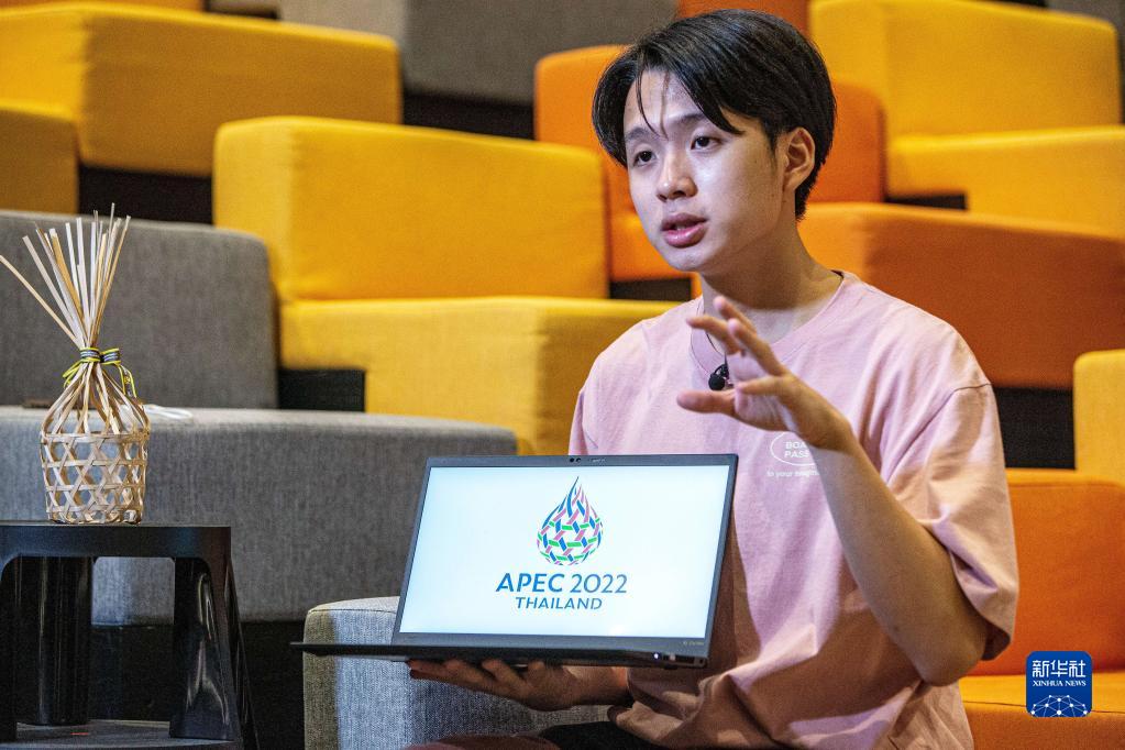 11月5日,在泰国曼谷朱拉隆功大学,会徽设计者查瓦农·翁特拉库容介绍自己的设计理念。