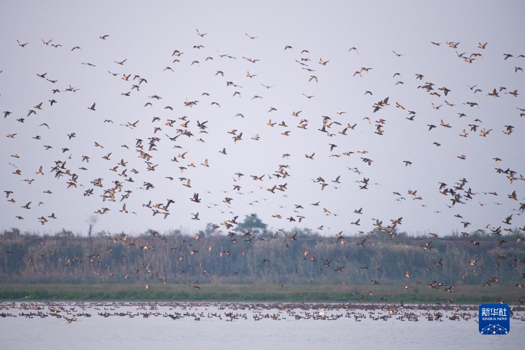 11月10日,成群的罗纹鸭在湖南西洞庭湖国家级自然保护区低飞。 新华社记者陈思汗摄