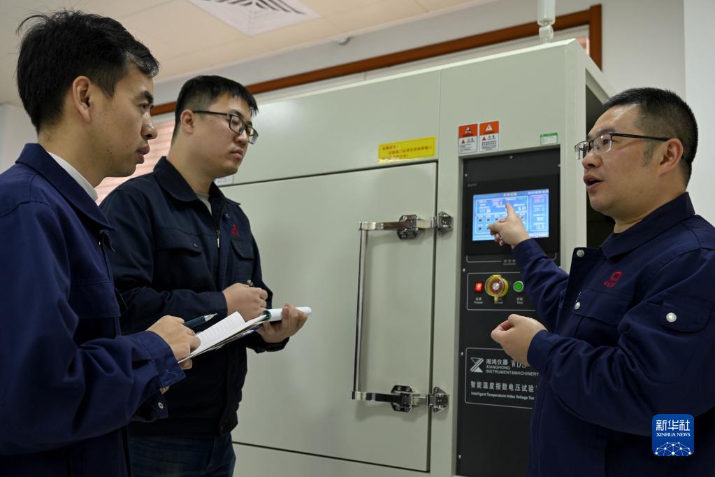 11月16日,在位于安徽省铜陵市的铜陵精达特种电磁线股份有限公司实验室,苏保信(右)为工作人员讲解热老化耐压试验仪的操作规程。