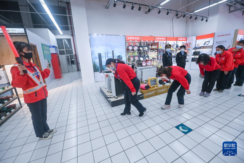 11月17日,超市疏散引导人员(左一)在现场演练中引导人们有序疏散。