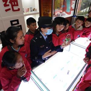 11月17日,民警在贵州省遵义市第四十中学禁毒教育基地为学生讲解禁毒知识。