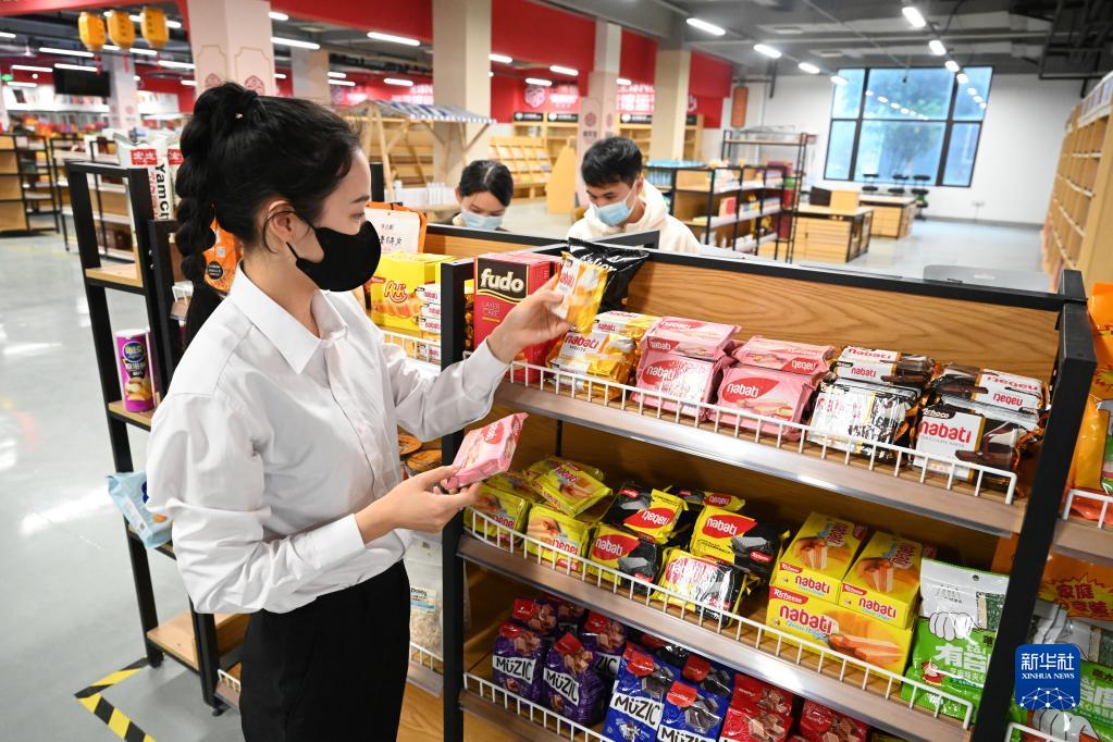 11月16日,参观者在福州元洪投资区元洪食品数字经济产业中心的元洪在线展示体验中心选购印尼食品。