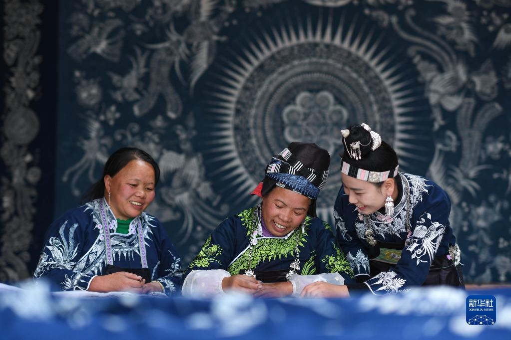 在贵州省丹寨县龙泉镇卡拉村的苗族蜡染工坊,村民在画蜡画(11月16日摄)。