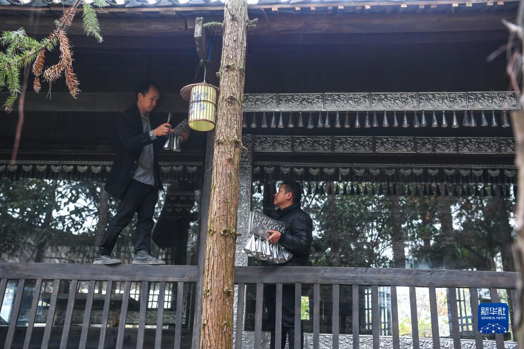 村民在贵州省丹寨县龙泉镇卡拉村的苗族吊脚楼上悬挂银饰装饰品(11月16日摄)。