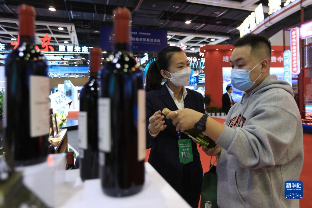 11月18日,参观者在洽谈会期间举行的“绿色智造产业产品展”上了解展出的红酒。