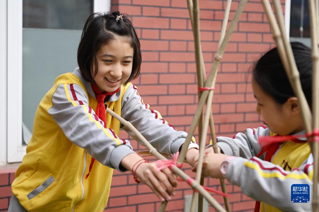 11月17日,天津市和平区中心小学的学生在搭设竹架。