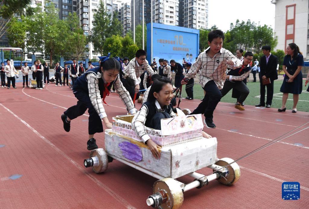当日,广西南宁市滨湖路小学教育集团山语城校区举行庆祝落成10周年活动,孩子们以民族舞蹈、环保纸车赛等活动迎校庆。