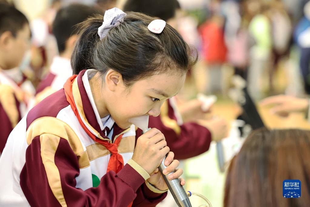 11月18日,天津市和平区万全小学学生在《国家学生体质健康标准》测试中进行肺活量测试。