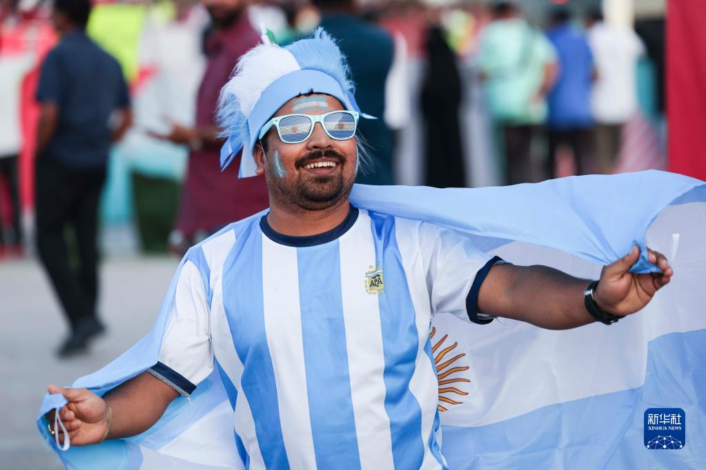 11月18日,一名阿根廷队球迷在卡塔尔多哈的滨海大道留影。