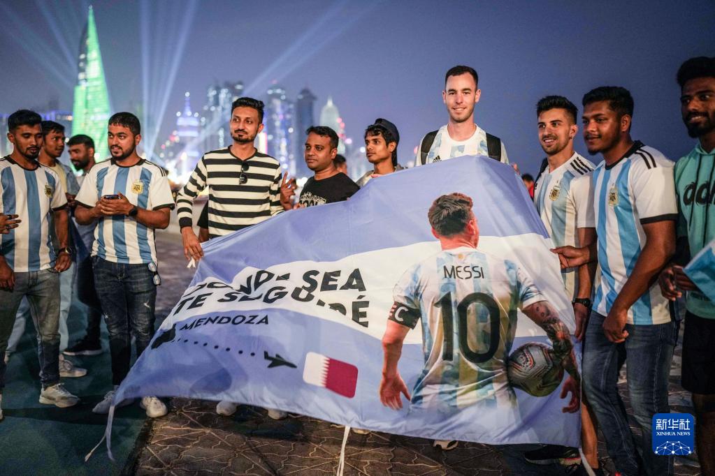 11月18日,球迷在滨海大道展开绘有梅西的旗帜。