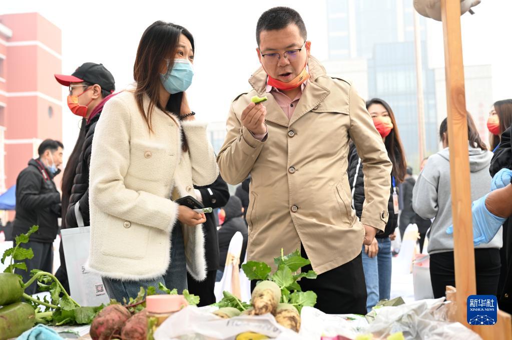 在天津市西青区辛口镇第十五届沙窝萝卜文化旅游节上,参观者在品尝沙窝萝卜(11月18日摄)。