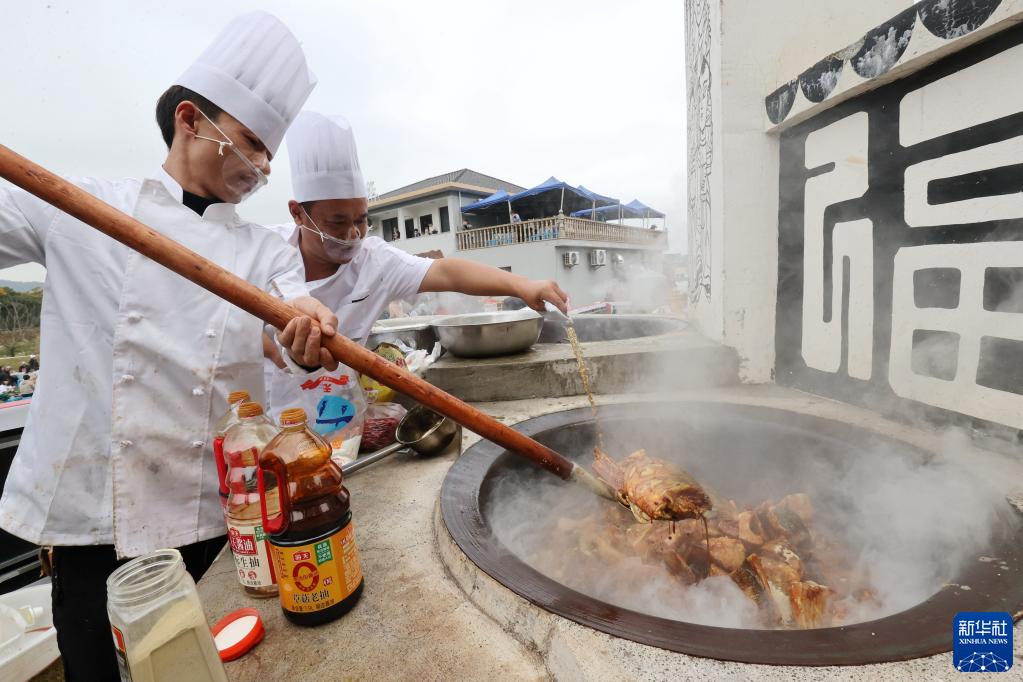 11月19日,厨师在现场烹饪当地特色的鱼汤饭。