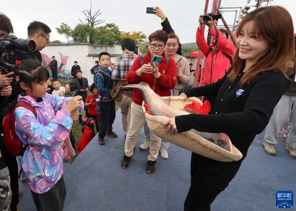 11月19日,游客在活动现场观赏捕获的“鱼王”。