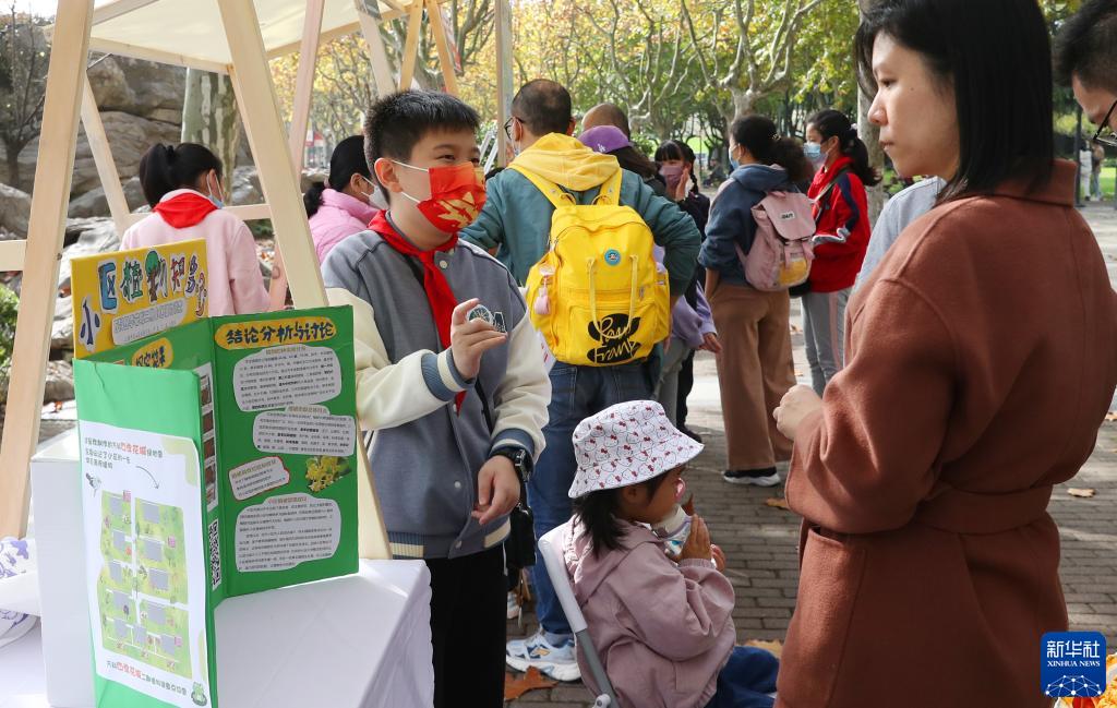 11月20日,上海市宝山区杨泰实验小学的白碧鸿同学(中)在科学集市上向参观者介绍居民小区植物探究成果。