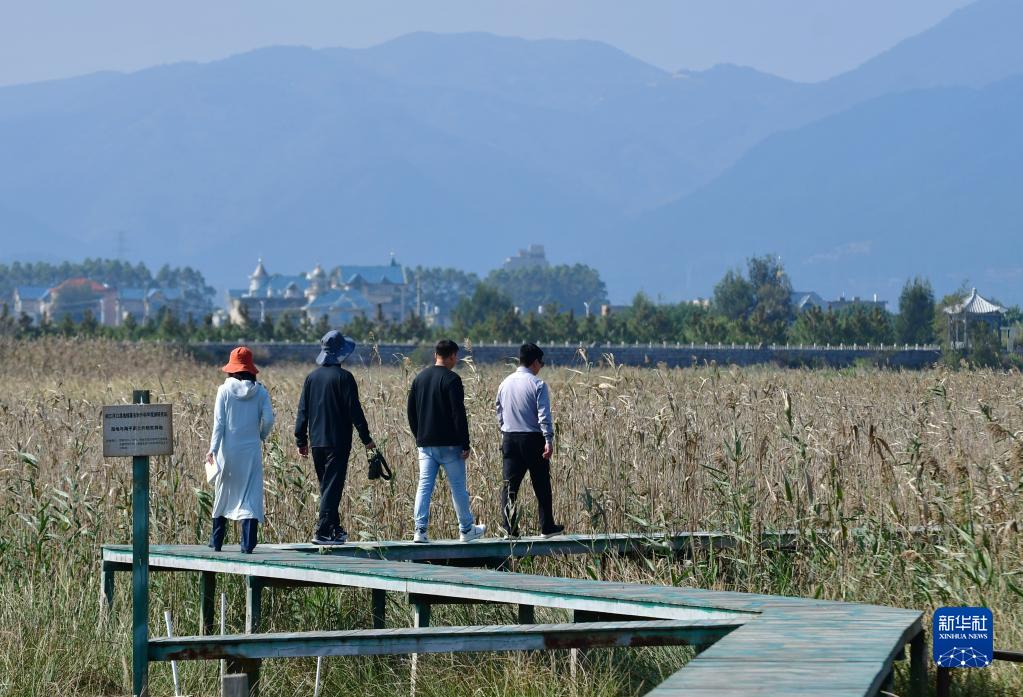 张潮巨和同事在闽江河口湿地核心区域观测湿地植被生长状况(11月19日摄)。
