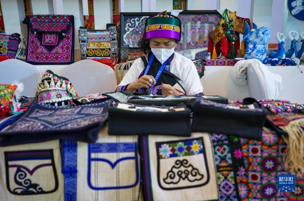 11月20日,一名彝绣传承人在南博会旅游文化馆内进行刺绣展示。