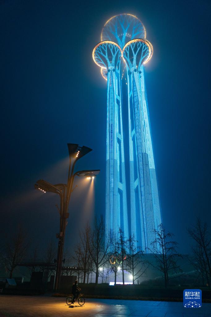 11月20日,北京奥林匹克塔为世界儿童日亮灯。