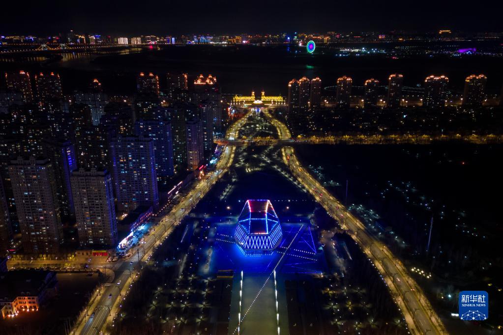 11月20日,哈尔滨音乐厅为世界儿童日亮灯(无人机照片)。