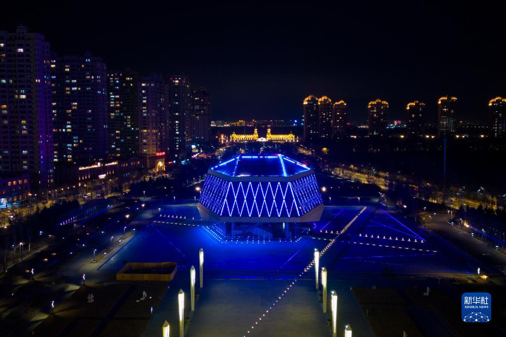 11月20日,哈尔滨音乐厅为世界儿童日亮灯(无人机照片)。